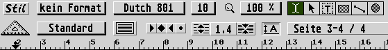 Der erste Start von Papyrus 4 ließ ein zufriedenes Lächeln aufkommen - das Programm wurde mit 3D-Look und einem erweiterten Dokumentfenster an die Ansprüche moderner Multitasking-Umgebungen angepaßt. Das Dokumentfenster enthält nun in der Menüleiste zusätzlich (neben Absatzformat, Tabulatoren, Zeilenabstand und Seite) auch das neue Stilformat, eine Zeichensatz-Auswahl inklusive Größenänderung, die Zoom-Funktion und vor allem Icons für den Objekt-Modus, mit denen zwischen Textbearbeitung, Objektbearbeitung und Objekterzeugung (Geraden, Rechtecke, Textboxen und - neu - Ellipsen) hin- und hergeschaltet werden kann. Auf die wichtigsten Funktionen kann jetzt somit direkt über die Linealleiste zugegriffen werden. Die Lupenfunktion erlaubt jetzt auch die freie Auswahl eines bildschirmfüllend zu vergrößernden Textausschnitts.