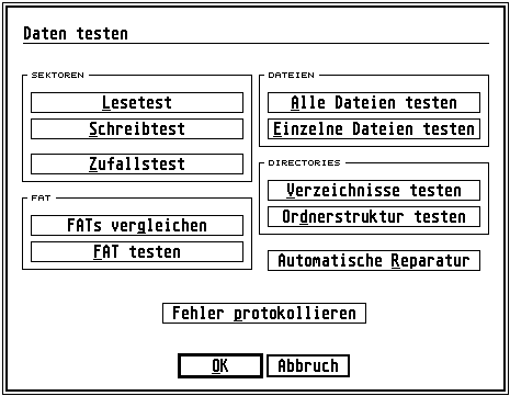Daten testen dient zum Überprüfen des Laufwerkes, um festzustellen, das weder in der FAT noch im Directory noch im Datenteil des Laufwerkes fehlerhafte Sektoren liegen bzw. das die FAT falsche Einträge enthält und es so zu Problemen mit dem Datenbestand kommen kann.
