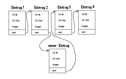 Es wird ein Element in eine sortierte Liste eingefügt. Die Liste ist nach CD-Titel geordnet.