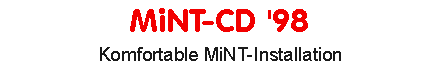 Mit Hilfe dieser CD ist eine komfortable Installation von MiNT auf einem ATARI oder kompatiblen Rechner möglich. Ferner befinden sich auf dieser CD aktuelle Treiber für die Vernetzung von ATARIs und Kompatiblen über TCP/IP mit dem Rest der Welt, z.B. Windows, Mac, Unix (Linux/FreeBSD/NetBSD etc.).