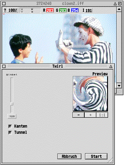 Etwas unlogisch ist die Vorgehensweise bei Sicherheitsrückfragen - es wird beispielsweise beim Drehen um 90 Grad nochmals per Alert nachgefragt, ob man das wirklich wolle - bei einem irreversiblen Effekt wie etwa "Scatman's World" aber nicht. Durch mehrfaches Drehen bekommt man immer das Ausgangsbild wiederhergestellt, so daß Sicherheitsabfragen hier unnötig erscheinen (man kann sie auch mit dem Profimodus ausschalten). Bei anderen Effektmodulen, deren Wirkung nicht umkehrbar ist, fehlt dies hingegen, was auch zu begrüßen ist, denn ständige Rückfragen, ob man wirklich das will, was man will, lassen mit der Zeit an einem selbst zweifeln. Spaß beiseite: Dieser Kritikpunkt erledigt sich, wenn es ein mehrstufiges Undo geben wird.