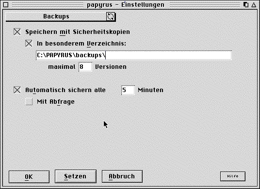 Optional können Sie zudem festlegen, in welchem Pfad dieses geschehen soll. Sie können sich also bspw. im Ordner PAPYRUS einen Ordner BACKUPS anlegen (geht auch automatisch mit papyrus) und dort Ihre Backups abspeichern lassen.