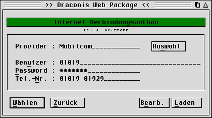 Je nach Einstellung wurde entweder ein Accessory installiert, oder der Aufruf von "Draconis" erfolgt aus dem BIN-Ordner. Zuerst erscheint ein Dialog, in dem der Provider ausgewählt werden kann. Weiterhin bietet sich hier die Möglichkeit, Paßwort und Benutzername zu ändern. Ersteres vor allem dann, wenn es aus Sicherheitsgründen nicht gespeichert wurde.