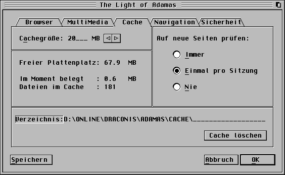 Durch den Cache läßt sich auch surfen, allerdings nicht so komfortabel wie unter Cab, wo dafür ja ein Modul existiert. Man kann jedoch gezielt die Seiten aus dem Cache aufrufen. Bilder werden dort sowohl in geditherter Form als auch im Original gehalten, was zwar mehr Plattenplatz kostet, jedoch den Aufbau einer gecacheten Seite ungemein beschleunigt.