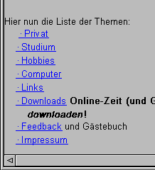 Die Interpretation von HTML ist ganz gut - unterstützt wird HTML 3.2 sowie die Frame-Erweiterung von Netscape. Jedoch werden einige Tags etwas unschön dargestellt. Bei Frames wird das TARGET _BLANK noch nicht unterstützt, weiterhin wird der Code im NOFRAMES-Teil interpretiert - auch wenn FRAMES aktiv sind. Das kann dazu führen, daß zwei Seiten übereinander dargestellt werden, falls im NOFRAME-Teil eine automatische Weiterleitung eingebaut ist. Das führt zwangsläufig zu einem seltsamen Verhalten. Beide Fehler sind dem Autor jedoch bekannt und mindestens das TARGET _BLANK wird in der nächsten Version funktionieren (Update kostenlos). Nicht schön war auch die Darstellung von Listen, bei denen der runde Punkt sehr klein geraten ist.