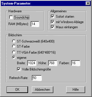 Erwähnen sollte ich noch die Refresh-Rate; diese bezeichnet die Frequenz, mit der der MPC-Bildschirm aktualisiert wird und hat nichts mit der Bildwiederholfrequenz des Monitors zu tun! Dabei werden mit höheren Werten Bewegungen (z.B. des Mauszeigers) auf dem Bildschirm flüssiger, MagiC wird jedoch insgesamt gebremst. Auf einem schnellen Pentium-Rechner kann man jedoch ohne weiteres einen Wert von 50 Bildern pro Sekunde eintragen. Bei Verwendung von NVDI-PC bzw. NVDI 5 ist die Refresh-Rate allerdings unerheblich, der Rechner wird nicht mehr ausgebremst.