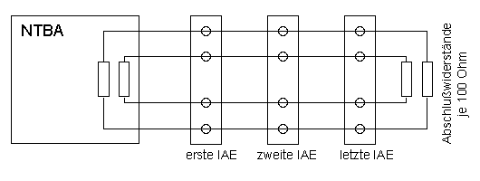 Die beiden 100 Ohm Widerstände (>= 0,1W) dienen zum Abschluß der vier Adern. Von diesen werden zwei für die Sende- und zwei für die Empfangsrichtung verwendet. Ein Abschluß (Terminierung) ist, ähnlich dem SCSI-Bus, zur Vermeidung von Störungen (Reflexionen) notwendig.