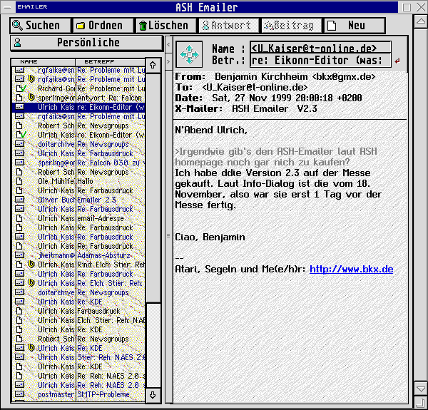 Die Aufteilung der beiden Fensterteile läßt sich frei bestimmen, so daß man je nach Bedarf dem Nachrichtentext oder der -Übersicht mehr Platz einräumt. Weiterhin stellt man mit den beiden Pfeilen (oben an der Trennlinie) den linken oder rechten Teilbereich auf volle Fenstergröße ein, was sinnvollerweise auch über Control-Cursor möglich ist. Diese "Nebeneinander"-Darstellung ist leider etwas unübersichtlich, es bleibt nicht genügend Platz, um Absender, Betreff und Nachrichtentext in der gewünschten Breite zu sehen (es sei denn, man hat einen Großbildschirm mit entsprechender Auflösung). Hier würde man sich eher eine Darstellung wünschen, wie sie bei aMail gewählt wurde: nämlich Liste und Text übereinander.