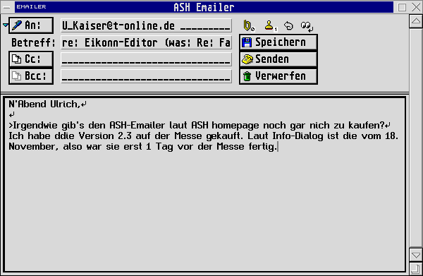 Leider unterstützt der Emailer keine Initialen vor dem > beim Quoten, so daß man vor allem bei Mehrfachquotes (gequoteten Quotes) nicht mehr nachvollziehen kann, wer eigentlich was geschrieben hat. Dafür achtet der Emailer auf die Netiquette: Wenn man in einer Antwort zu viel gequotet hat (im Verhältnis zum selbst geschriebenen Text), gibt der Emailer einen Warnhinweis aus.