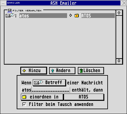 Mit Filtern verhindert man beispielsweise das Abholen von Nachrichten, die bestimmte Absender oder Betreffs enthalten. Die eingestellten Filter lassen sich automatisch nach dem Nachrichtenaustausch ausführen oder später von Hand starten, wobei ein beliebiger Begriff im Betreff, Abesender oder Empfänger als Kriterium dient, um Nachrichten in frei wählbare Ordner einzusortieren.